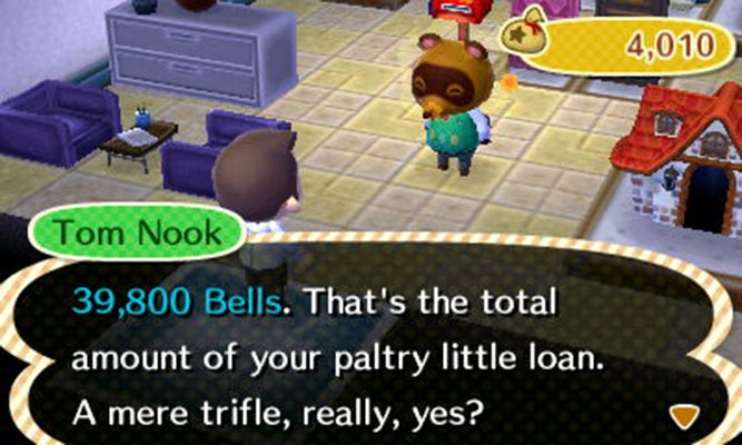 I didn’t know what Fang wanted but I think he said something about new furniture. I started to make my way towards Nookling Junction. I stopped at the noticeboard and saw that the store was going to have a half price sale after 7:00pm tonight. I figured I’d come back then to look for something for Fang. I decided it was time to go to Nook’s Real estate to find out how much I owe him. I was greeted with his pretentious smile. He said it was good to see me. I said to cut the bullshit and lay it on me.