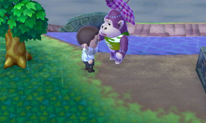 I made my way to the Gyroid in charge of the new bridge to see how donations were coming along. Being that I had to walk all the way around the river, undoubtedly I was stopped by Boone, the gorilla. He made a point of telling me how much of a manly man he was and how scrawny I was in comparison. I feel like he’s trying to compensate for something. Maybe even hiding something. Was he the trap setting son of a bitch I was looking for?