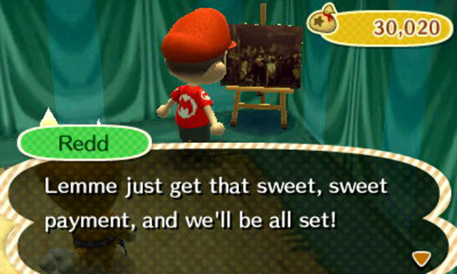 The fox played it sly. Heh, just like a fox would. He went in to his usual spiel. I cut him off half way and demanded reimbursement for the fake artwork. He began apologising profusely. Nice try buddy. I don’t buy your bullcrap. I told him he knowingly sold me a forgery. He stopped and looked at me. He thought for a second and then spoke. He said that it was true. He knew it was a fake. He knowingly sells them at all towns. He said that I should compare the paintings to versions online to compare them if I want to buy something. That way I would know if something is fake before I buy it.