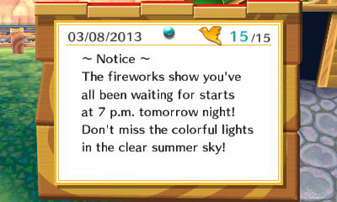 I went to the post office and saw the happy smiley pelican, Pelly, sitting behind the counter. She called me over and said that there was a special gift waiting for me. It was a Fireworks Table. I think there is a theme to this month… I went to the ATM to see how much I owed on my Home loan. It was like $80,000. Chump change really. I transferred the funds and felt the sweet, yet fleeting relief of being out of debt to Tom Nook.