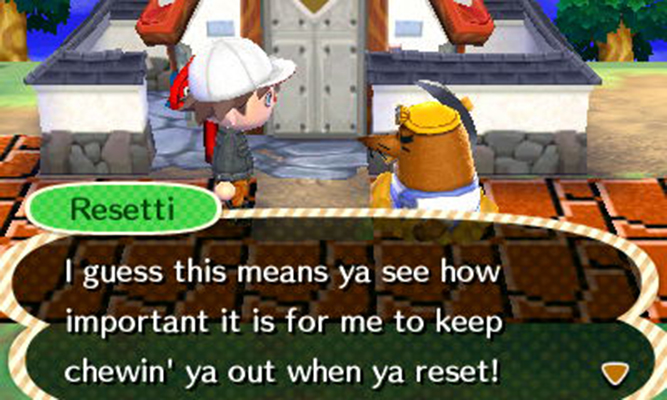 I heard a boom like noise happening outside. I looked out my window and saw very little. I went out the door. Immediately Mr. Resetti forced his way from beneath the footpath in front of my house. He looked angry. I acknowledged him with a casual ‘sup. Though he had the demeanor of a grumpy house cat that dislikes everything, what he spoke about was anything but. He thanked me for finally getting enough revenue raised to complete the Reset Centre, or as I like to call it, The Mr Resetti Institute for the Saving Impaired or MRIFTSI for short. It wasn’t the greatest acronym ever but I only used it in private.