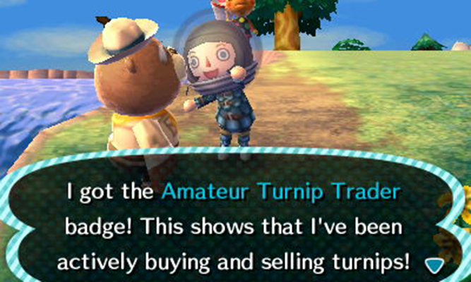 I went to the Town Square to see what was goin’ down today. Walking around my orchard was The fat old scout master looking guy. He wanted to give me a badge. Creepy, but I took it. It was to commemorate my awesome turnip trading skills.
