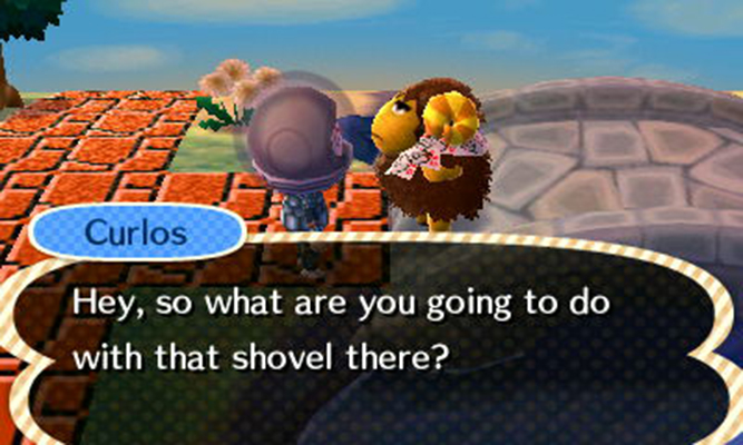 As the conversing with Mr Resetti came to a close, and in fact during the whole thing, I could still hear the boom-like noises. I suspected our fair town of Meowland was under attack. What was this? We had no enemies! Well, not yet anyway. Why had I not raised an army? Probably because the townsfolk are mostly cute and cuddly little animals. Well except for Dizzy. He’s an idiot. And I guess the two goats are rather ugly. And there’s Boone the cross dressing monkey. And Fang looks more vicious than cuddly. Not to mention Princess Leia is starting to look her age… The elephant aint no looker either.